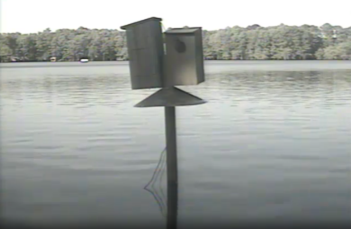 Smithfield, North Carolina, USA 'This is a live inside view of a wood duck nest box. The camera is located on Holt Lake near Smithfield, North Carolina. After the eggs hatch the ducklets will remain in the nest for up to 18 hours before jumping out. The camera is mounted on the inside top corner of the nest box facing down.' |