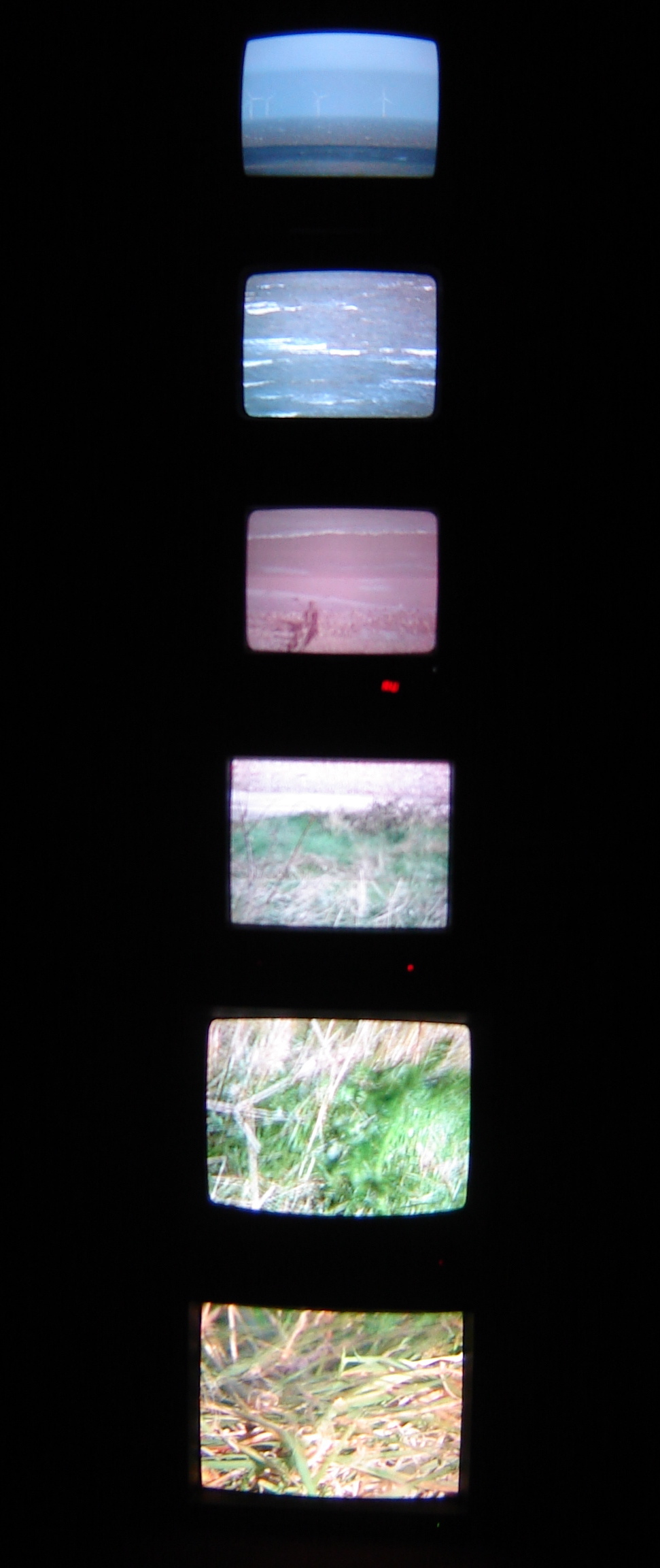6 small TVs were stacked and wired to a timber pillar for support. The 6 short video clips played in independent loops on 6 DVD players.