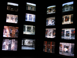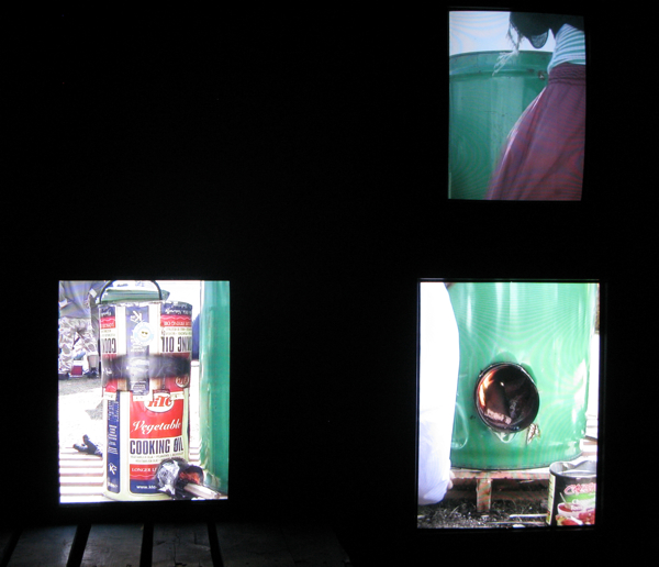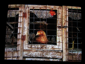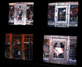 | Chicken market in Mtwara S Tanzania August 2008 reconstruction 25 channel video on recycled stacked TVs | ||
