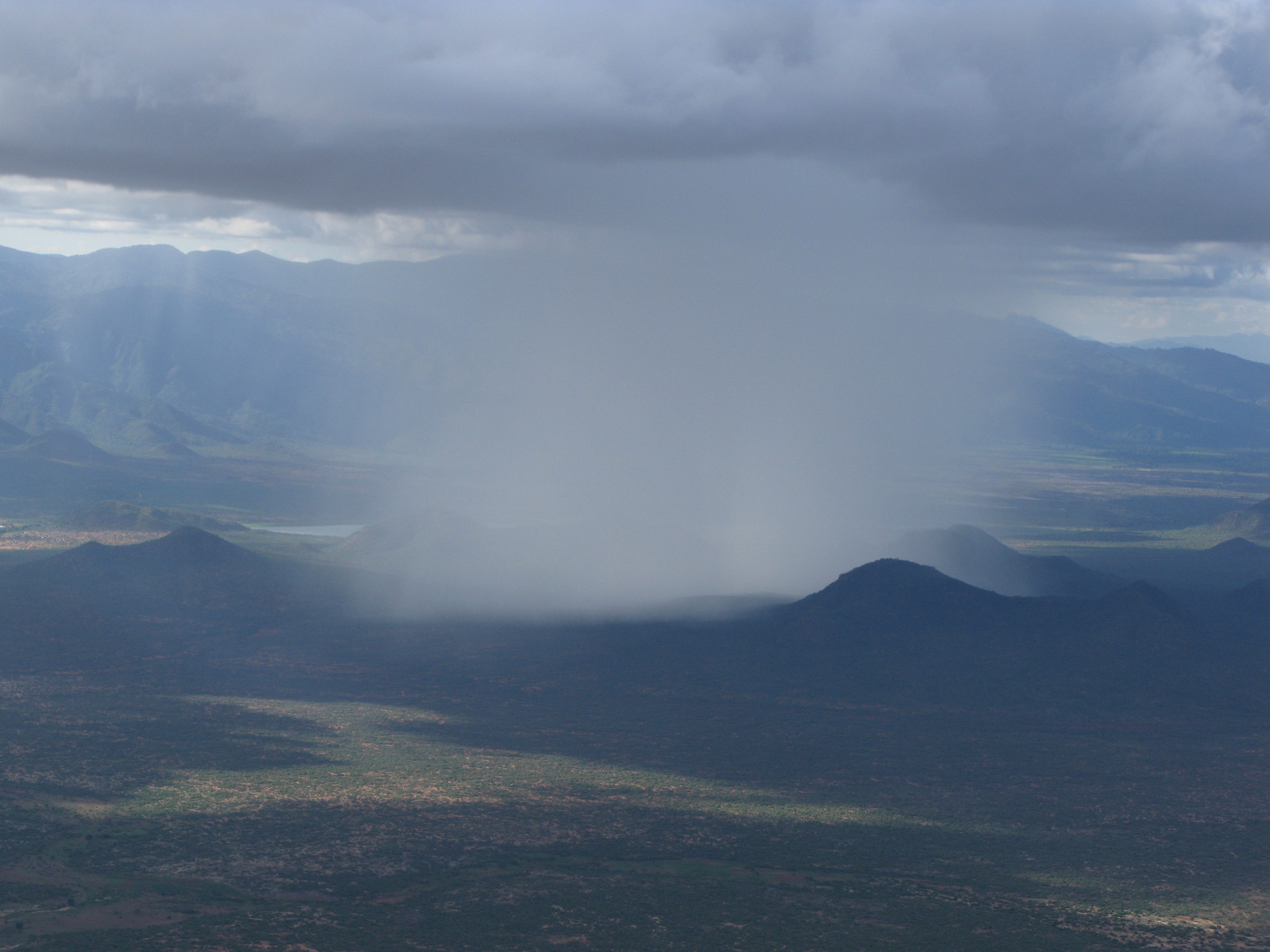 you're sitting outside the Fix House at Mambo Viewpoint, waiting for the cloud to blow over. one moment the plain is open, crossed by sheets of rain or cloud shadows. the next moment a mass of grey and white cloud and mist covers the mountain tip, broken by clips of filtered sun. the leaves of the eucalyptus clatter together and release their scent. birds have left the area except for a few distant calls or excerpts of song. the floor of the plain is red to yellow soil, partially, very sparsely or sometimes thickly covered by woody vegetation like clumps of hair glued to the scalp of a mask. yellowish or reddish tracks traverse the floor in series of tight or loose meanders in the way of a hair [on a plate or a sheet]. in other areas eg near a lake the margins are much smoother: light, bright green, with a thin umber fringe by the water: a beach or rocks, shingle or dark sand, or silt. in the middle to far distance, a few glints of light are reflections off metal roofs or glass. washing has been hung over the low wooden railing of sticks held to the tops of posts with bent rusted nails: light and dark grey, brown and black, black socks and shirts with a grey and a blue pair of trousers and a faded green and brown green and white striped pants. a little rain falls on the page and the ink spreads into a drop of water. you go in. _________